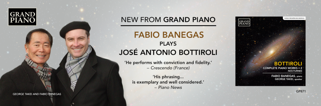 On May 28, 2021, Los Angeles-based Argentine pianist Fabio Banegas is releasing his new album, Bottiroli Piano Works (Complete), Vol. 2 · Nocturnes, on Grand Piano, the specialist piano label distributed by Naxos. The album notably includes narrations from Mr. George Takei — respected actor, author, and activist best known for originating the role as Star Trek’s Hikaru Sulu.