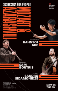 New York, NY — Experience a powerful evening of music as Orchestra for People presents Azarashvili, Mozart and Elgar on Tuesday, November 18, 2025 at 7:30 PM at NYC’s Merkin Hall. Under the baton of conductor Hahnsol Kim, the program introduces a vibrant dialogue between Georgian and European masterworks, featuring acclaimed soloists Sandro Sidamonidze (cello) and Sam Boutris (clarinet) in a bold and moving lineup that bridges centuries and continents.